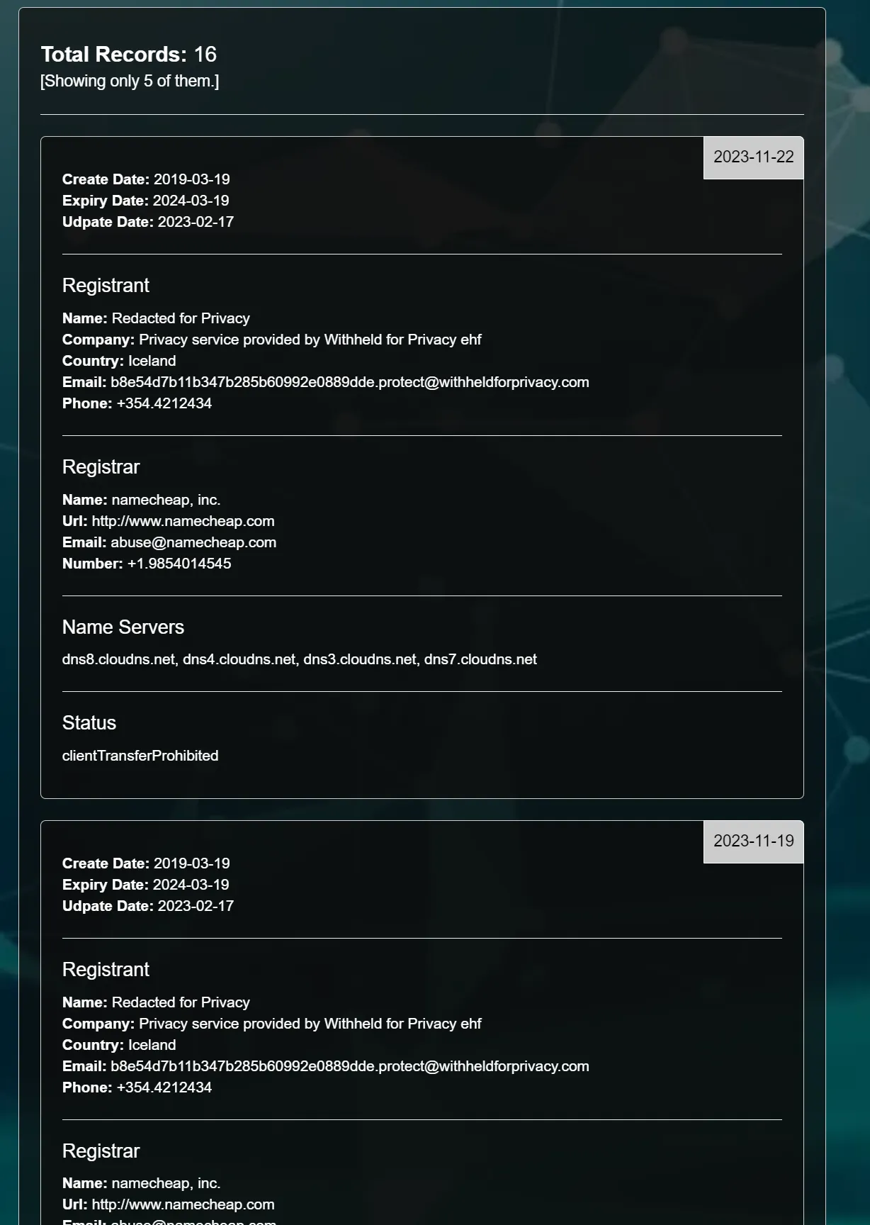 A Historical Whois Lookup tool is a specialized software or service that allows you to retrieve and analyze a domain name’s historical registration data records—the domain history. These domain history records include details such as the website ULR, domain owner’s name(s), contact information, registration and expiration dates, IP addresses, and any changes in ownership over time.