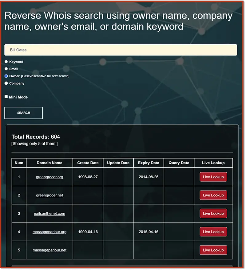 - Reverse WHOIS Lookup: Rather than starting with the domain itself, you start with an actual entity, such as a person or organization or keyword (or other search terms), and then try and locate all associated domains, information, and records associated with that search term.