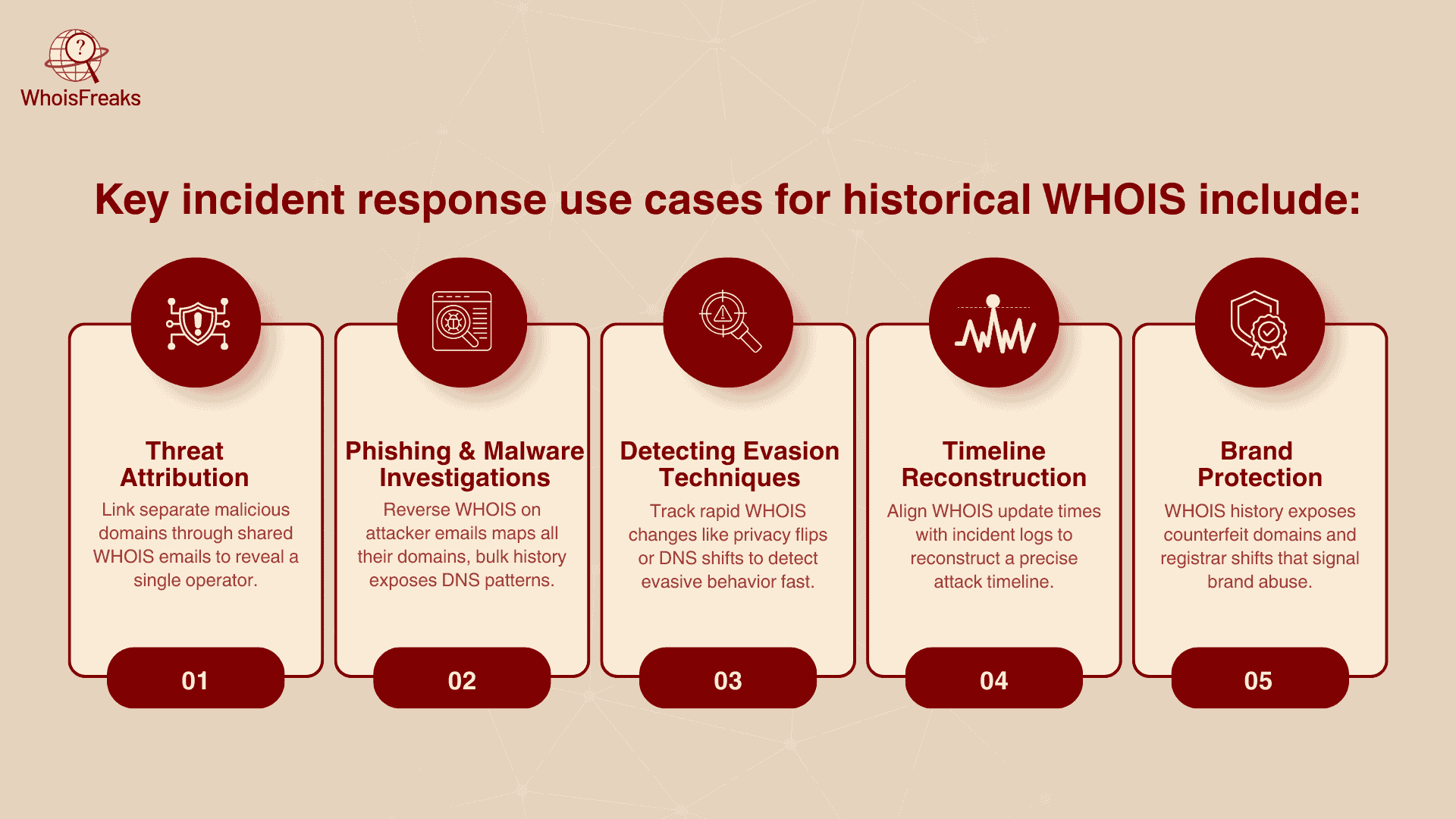 Incident response has numerous uses of historical WHOIS data. It assists the investigators to assign attacks by correlating domains with the threat actors. An example is when two or more malicious domains had identical registrant email addresses or organization names, WHOIS history would show that identical identifiers linked those domains to the same assailant. Cybercriminals often operate various domains with similar registration details, which helps in tracing and analyzing cyberattacks. Another suspicious transfer that is monitored by the analysts is an abrupt change of the domain registrant or registrar: the attacker may have sold the domain to another organization to avoid being tracked. The history of WHOIS will then record the time that transfer occurred and the new registrant.