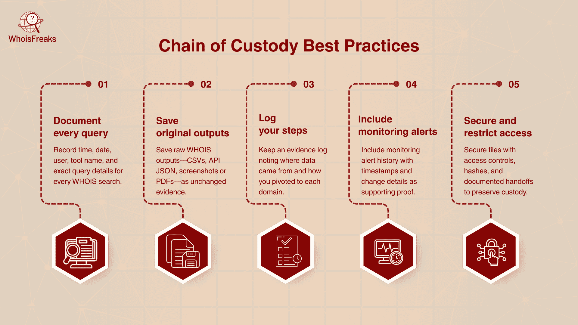 Document every lookup, save original WHOIS data, log actions, secure files, and track any handoffs of evidence.