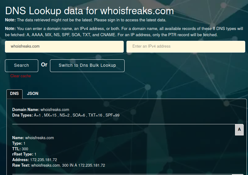 Use the WhoisFreaks DNS A Lookup tool to query DNS A records and receive clean, well-parsed results in JSON, XML, or raw format. Below is a screenshot showing the DNS lookup for the domain whoisfreaks.com.