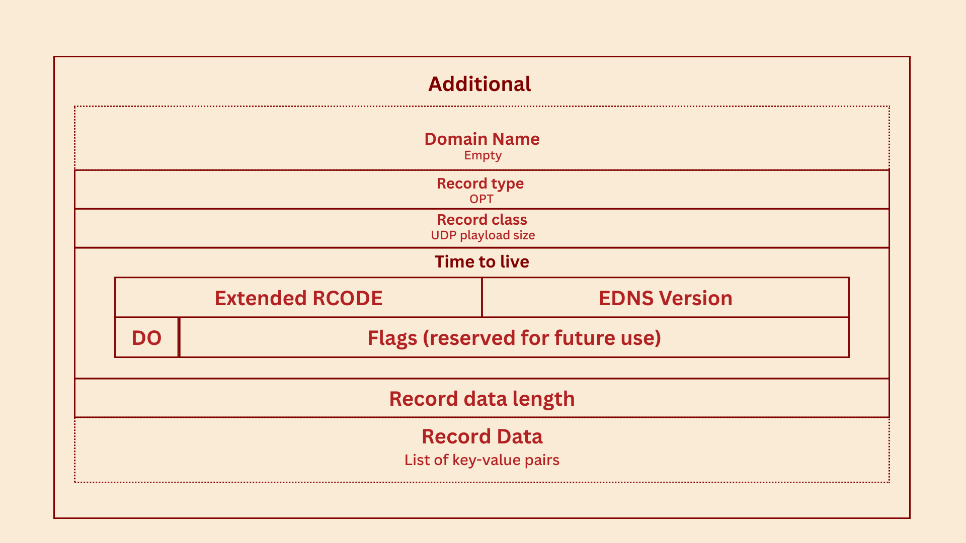 EDNS (Extension Mechanisms for DNS) extends the original DNS protocol to support additional features. Initially defined in 1999 and updated in 2013 (RFC 6891), EDNS addresses limitations in the standard protocol, such as the fixed length of the RCODE field by adding 8 extra bits for extended status codes. It also modifies the structure of the DNS Additional section by introducing a new pseudo-record type called OPT. This OPT record is included in queries sent to DNS servers that support EDNS. If the server recognizes EDNS, it responds with its own OPT record. If not, it simply ignores the OPT record. This design ensures backward compatibility with non-EDNS servers. Let's look at the updated structure of additional section with values.