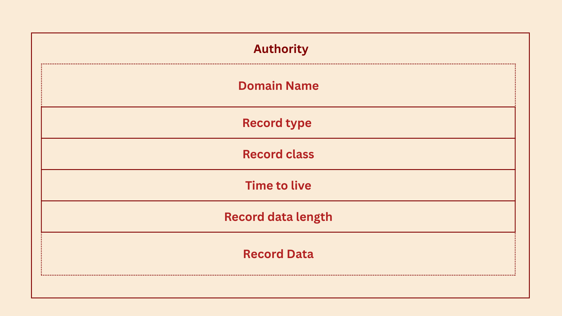 | Record data | Contains the DNS record itself; format depends on record type (e.g., IP address for A record) |