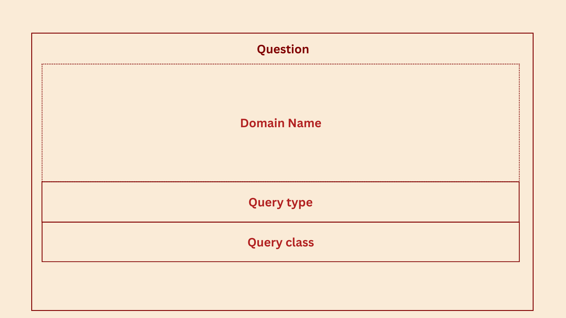 Question section contains the actual query. It is the query the client wants DNS server to answer. Question section contains only single query. It contains 3 fields.